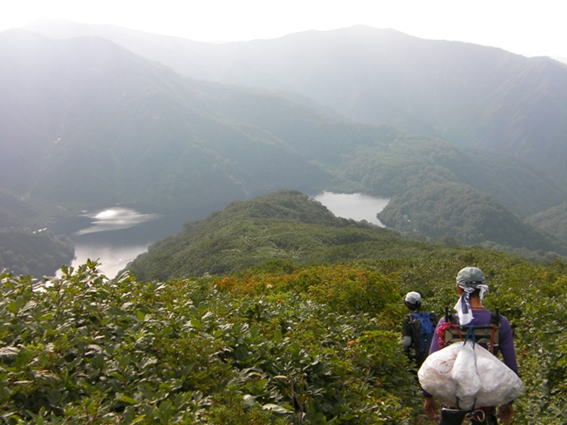 ここから小屋までの標高差約700m弱の下りが辛い.1年ぶりの登山で下り始める頃にはすでに筋肉痛である.あまりの辛さに,明日の作業はリタイアして帰ろうかなと真剣に考えていると大鳥池の水面が見えてきて,池のほとりをわずかにへつって息も絶えだえ大鳥小屋に辿りつく.