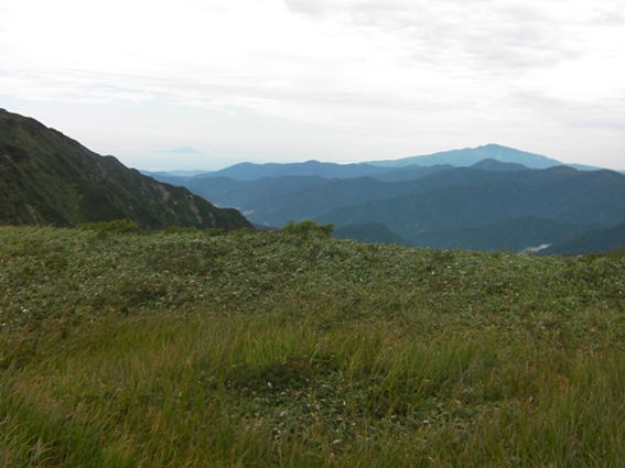 三角峰下部水場鞍部から月山(右)鳥海山(左/雲上)】