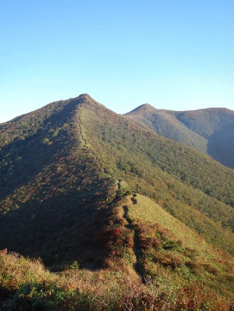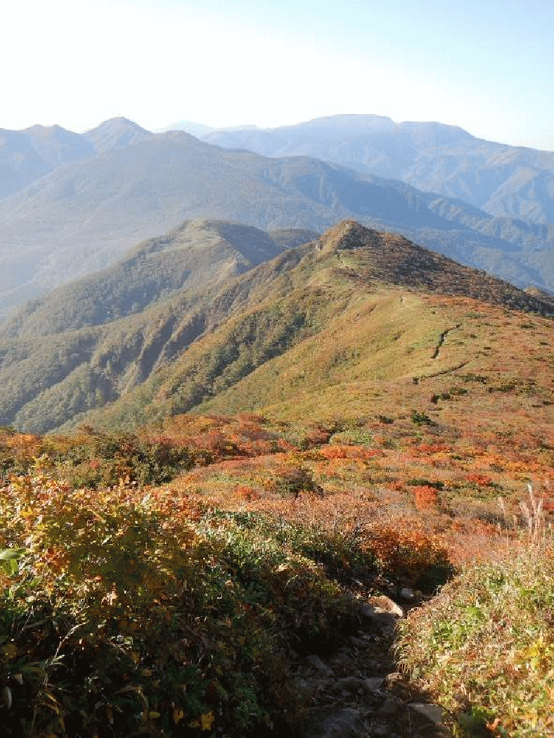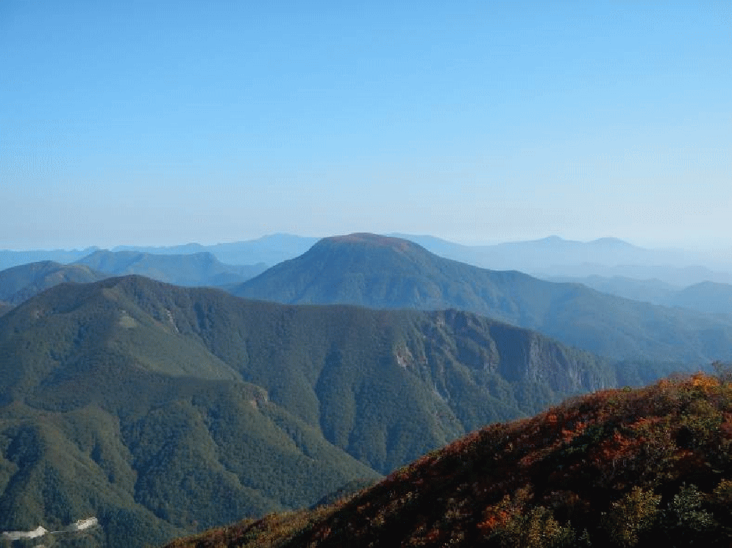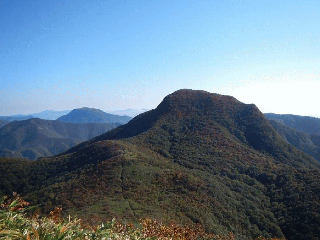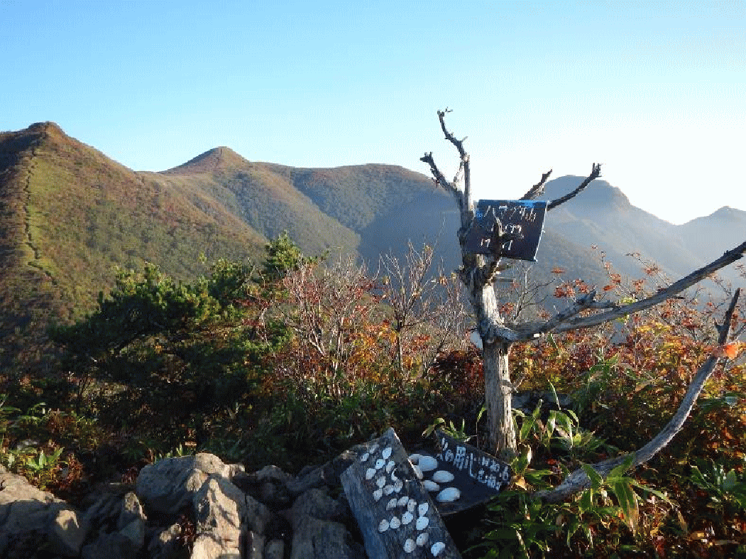 仙台神室から見た大東岳と二口山塊。大東岳の山頂あたりが色づいて見える。登りで誰にも会わず、誰もいない山頂。静かな時間を過ごす。