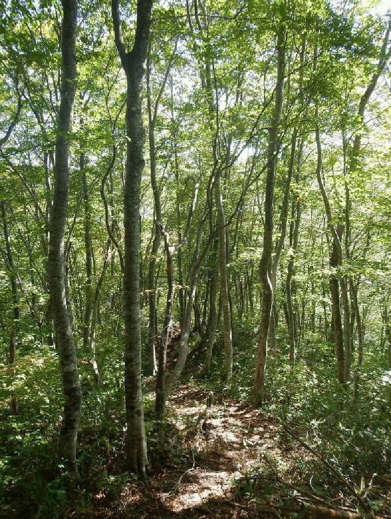 下りはダンゴ平から仙人大滝経由を行く。こちらはブナ林の中の沢沿いの道で、登りに使った尾根道よりも歩きにくく感じる。下りでやっと3パーティーとすれ違った。