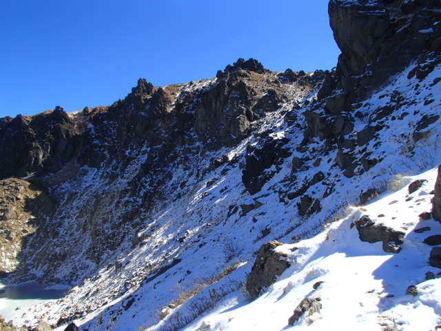 泊岩を過ぎ標高2000mあたりから雪が出てきた。山頂部の露岩帯の急な部分は雪が付いてまるで冬の八ヶ岳のような状態で、ここが一番の難所だった。特に下りは張ってあるロープが無ければ降りることはできなかっただろう。途中すれ違った長野の人も、こんなになっているとはと驚いていた。