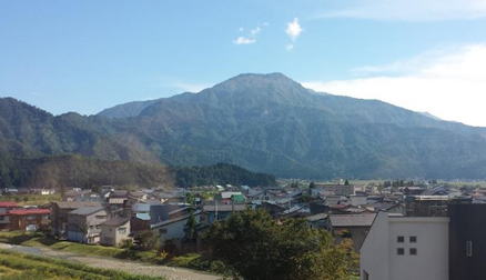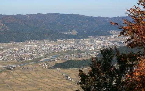 〈六日町から金城山、右側のスカイラインが観音山コース〉