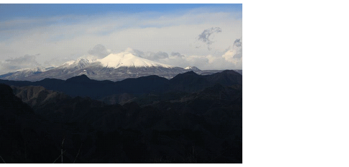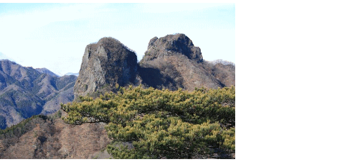 大久保登山口からはしばらくスギ林の中を行くとすぐに大天狗(天狗峠)となる。ここから四ッ又山までは雑木林の尾根を歩く。山頂からは西上州の山々をはじめ、赤城、榛名、妙義の上毛三山の展望がよい。この次に行く鹿岳も間近に見えるが、どうやって登るのか心配になるような山容だ。鹿岳の頂上は二つの岩峰になっていて、手前は一ノ岳、奥は二ノ岳と呼ばれている。