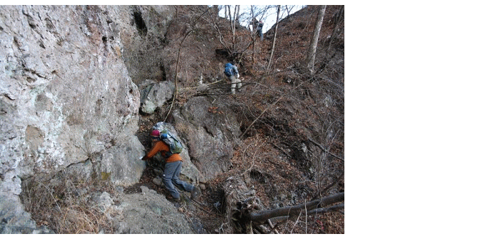 二ノ岳へはハシゴや鎖もあるが特に問題となるところはない。標高は二ノ岳が一ノ岳より若干高い。二ノ岳の頂上も広くはないが、山頂からは妙義、荒船、浅間山が見渡せ、暖かければゆっくりしたいところだ。天気は大崩れしないものの、風が冷たくて寒いので早めに下山する。