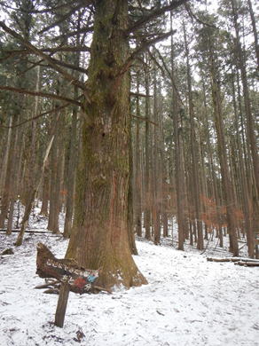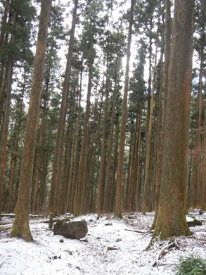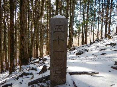 表参道コースから入り、シラジクボという峠から元に戻る一周コースを歩く。雪はうっすらと付いているだけだが、寒さは一級。杉並木に付けられたジグザグ道には〝丁目〟石があり、歩く目安となる。十四丁目石から登山道に入る。このコース、残念ながら見晴らしはまったく利かない。