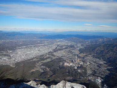 一の鳥居から五十一丁目で山頂だった。広い山頂の一角には御嶽神社ほか、東屋やトイレがある。山頂の展望台からは秩父盆地が眼下に広がっていた。両神山や浅間山、赤城山も見渡せる。しかし、周りにはフェンスが巡らされていて、石灰石の採掘現場がすぐ下まできていた。