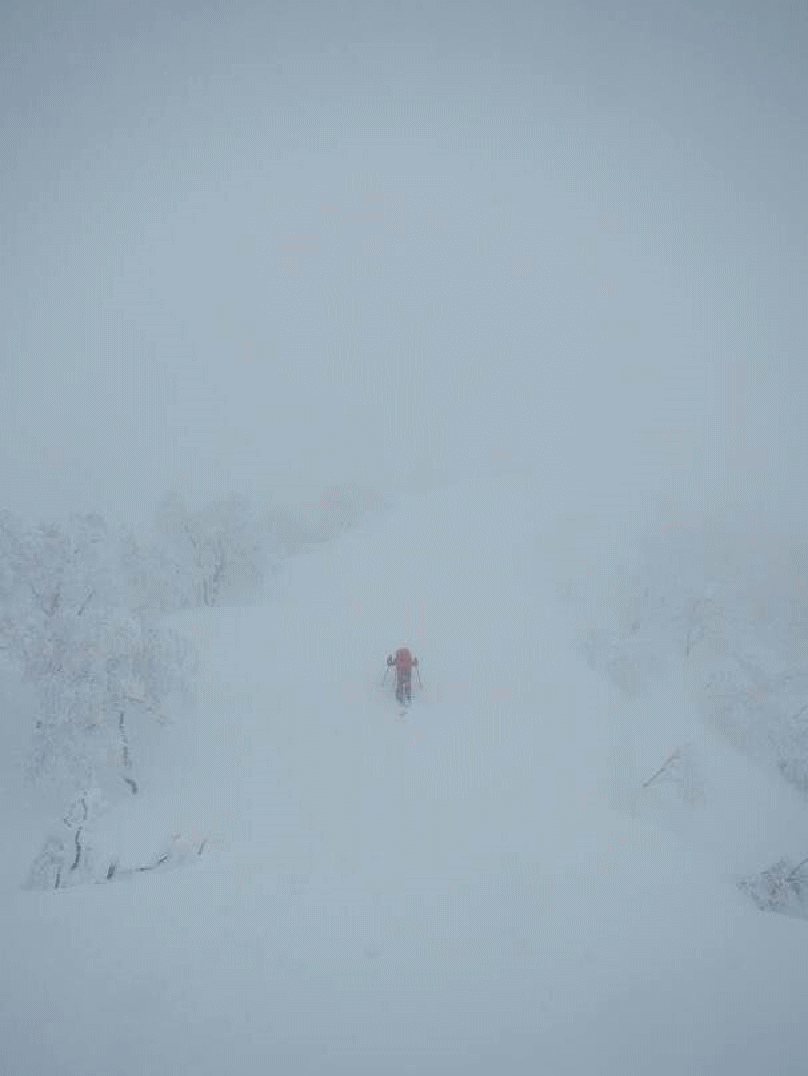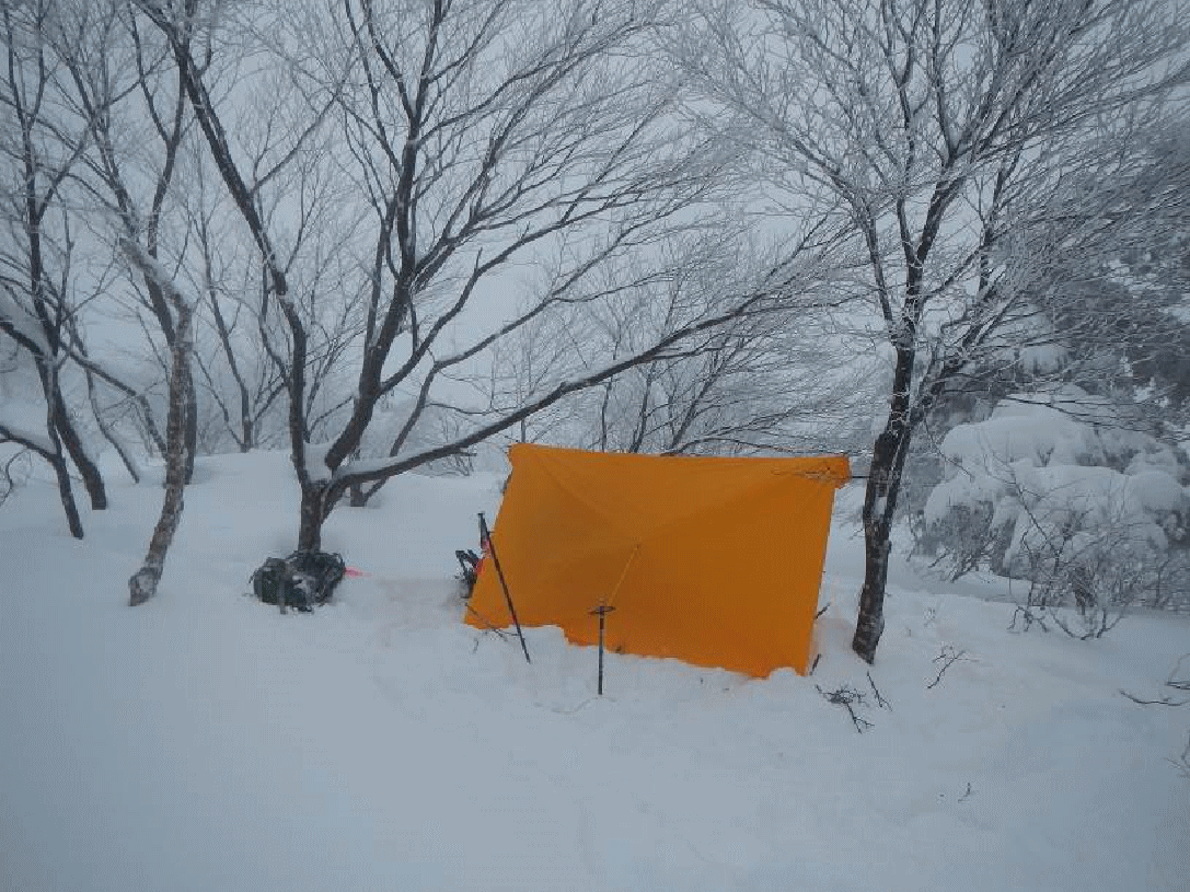 風とガスとで時折トレースが見えなくなる。目印テープが心強い。山葵山あたりまで下ってくると、雪も止み、風もおさまってきた。ようやく安堵でき、山葵山を過ぎたところでツエルトを張った。