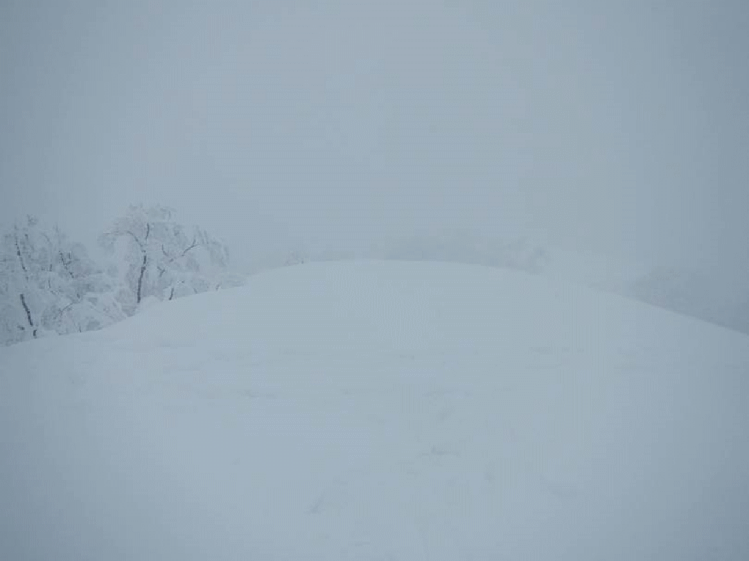 男性2人のパーティーは山葵山までとのことで、山頂直下でお礼を言い別れる。山葵山からの展望はなし。トレースも新雪と風で消えてなくなっていた。泥棒しようとしたトレースは残っていなかった。