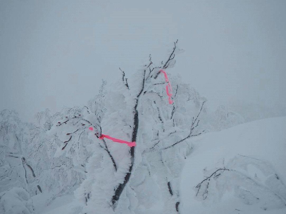 松平山山頂は深いガスの中だった。縦走組が付けたのだろうか、新しい目印テープが付いている。降り続く雪の中、風も強く、私たちのトレースもすぐに消されてしまいそうだ。すぐに山頂を後にした。