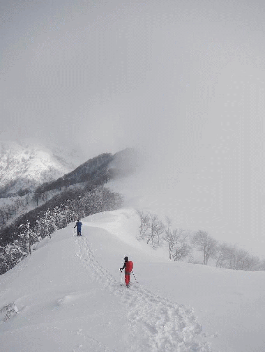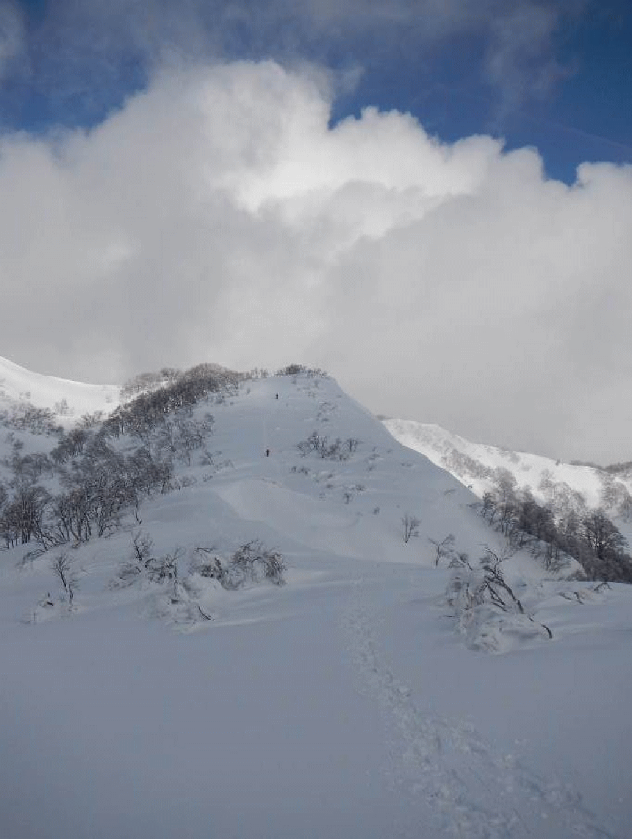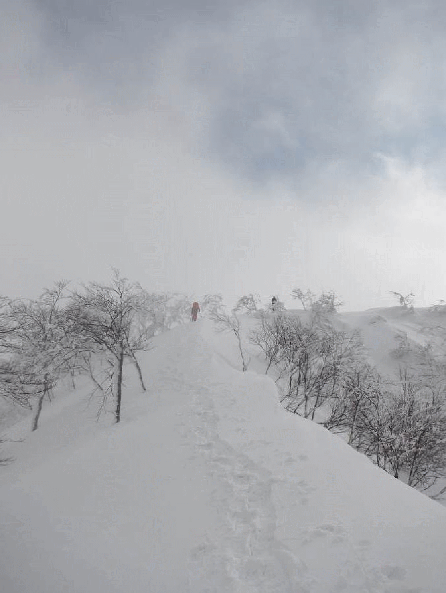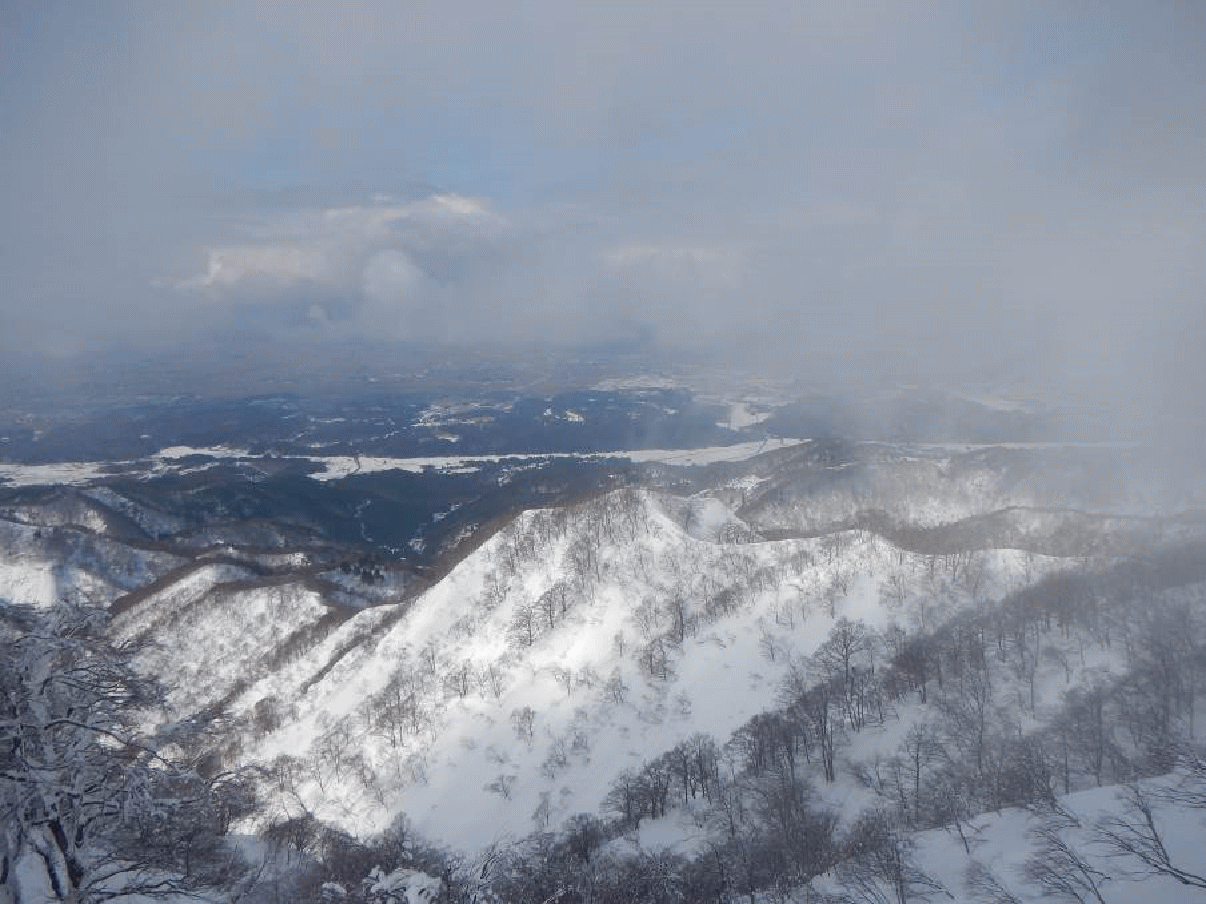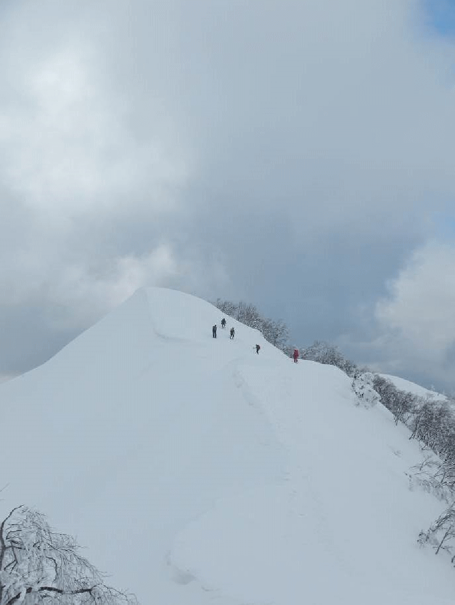 時間も早いので、五頭山まで縦走し、三ノ峰新道を下ることにする。厳冬の白い雪の稜線、流れるガス、時折これ以上ないくらいの青い空が広がる。五頭山に近づくにつれ、人影がはっきりとわかるようになる。大勢の人が行き来していた。