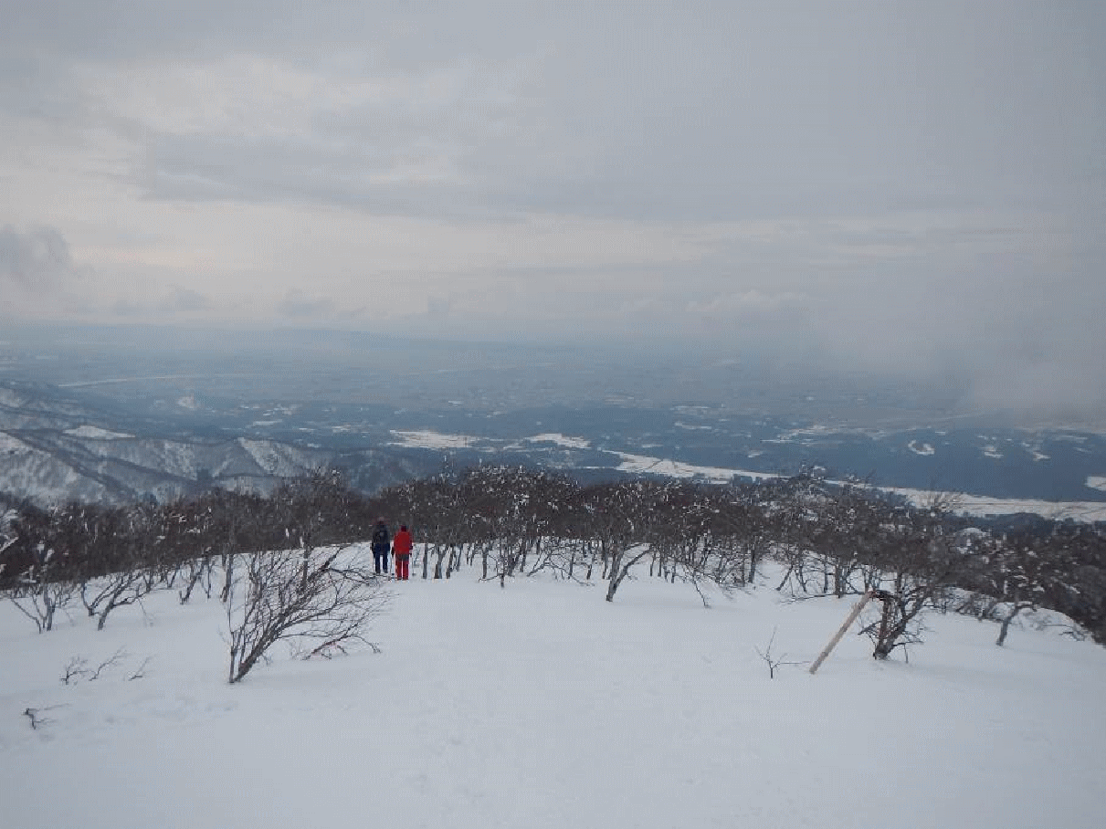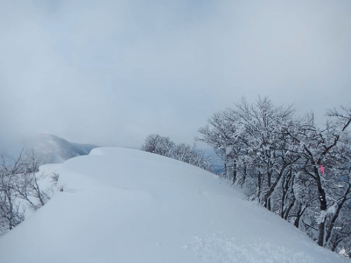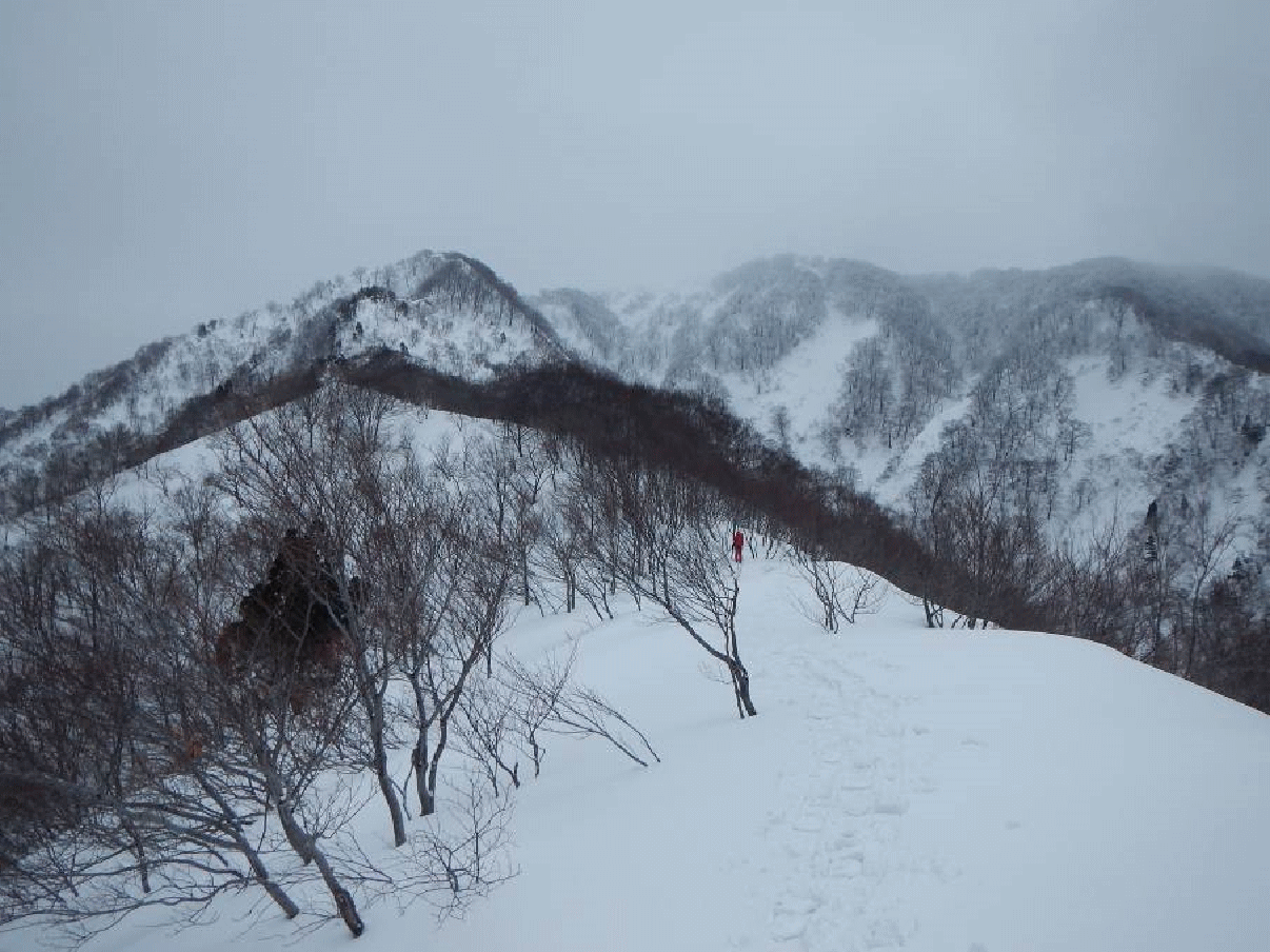 五頭山と菱ヶ岳の中間にある中ノ峰に登る。天気は曇り。スキー場手前の駐車場はすでに30台は止まっていた。私たちも準備をして出発する。橋を渡らずにそのまま行き、すぐの尾根に取り付く。顕著な尾根で、目印テープも付いている。しかし、急斜面を登り切り周りを見てみると、三ノ峰新道の尾根の横に私たちが登ろうとしていた尾根があった。菱ヶ岳への主尾根に取り付く尾根に登っていた。地図をよく見ないで登ったのが悪かった。