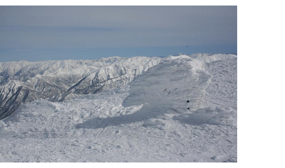 頂上に着くとヤカイ沢の方から強烈な風が吹き上げてきた。高気圧は足早に本州東方に移動してしまったようだ。360°の展望が広がり、南の方向には少し霞んではいるが、浅間山の向こうに八ヶ岳も見える。しかし、とてものんびりできるような状況ではない。