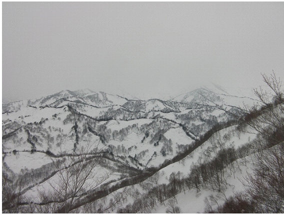 しかし,広い山頂の登ってきた尾根の反対側にはブナの林が広がっている.