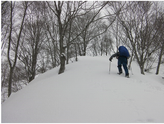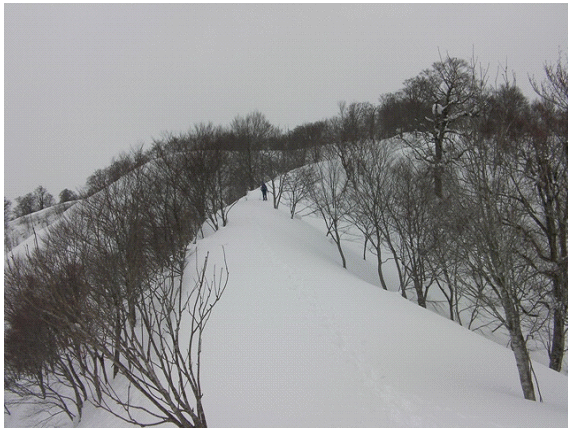 明瞭な尾根に上がると,初めは緩やかな斜面を歩く.