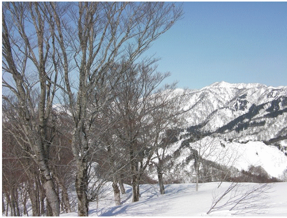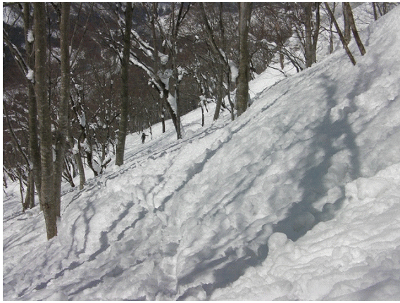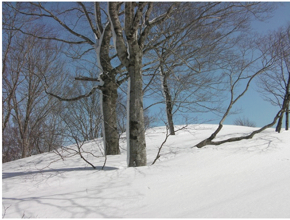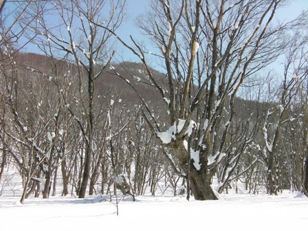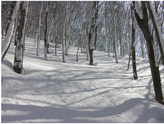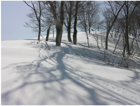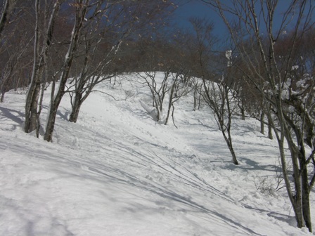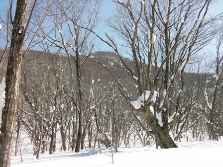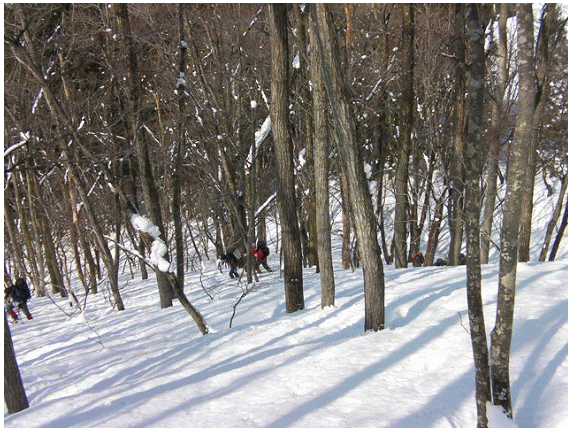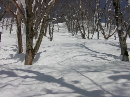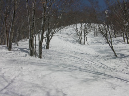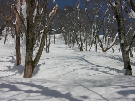 木の間隔も適当で,雪が良ければ滑りも楽しそうな斜面が続く.