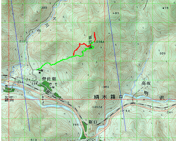 伊佐領小学校(標高215m)09:33 − 山頂(標高598m) 10:47〜13:40 − 伊佐領小学校 14:18