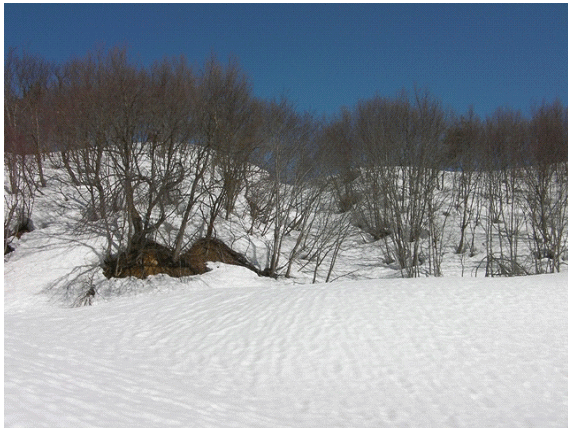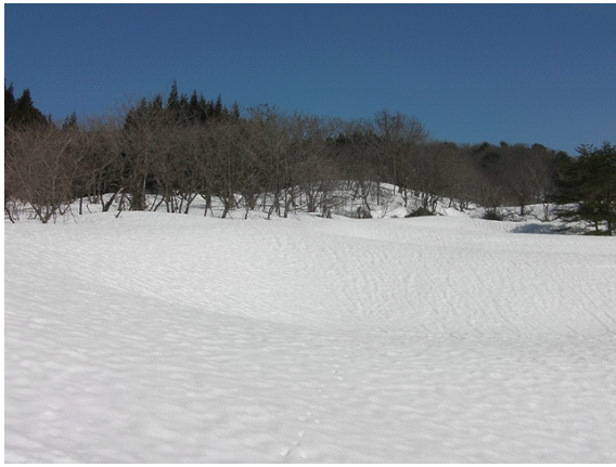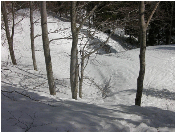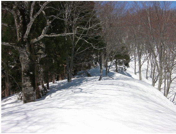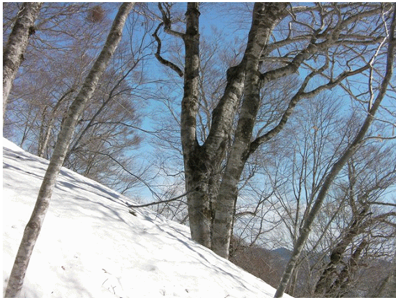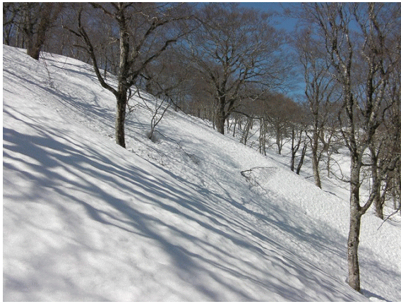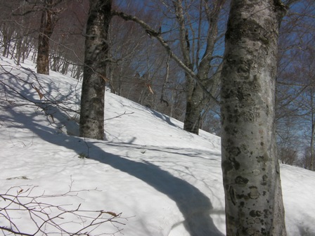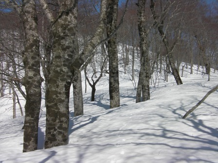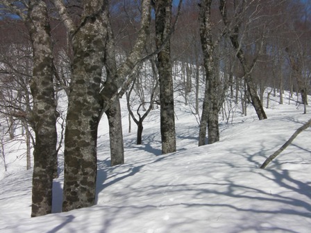 760m林道手前のスギ林の中は,まだ雪が固いうえに枝や葉が落ちていて,少々滑りにくかったが,ブナの斜面は十分楽しめた.