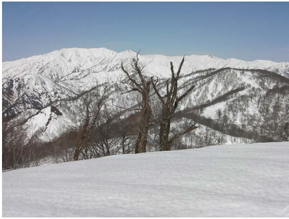 高森山側は大きく開けていて,大日岳から飯豊本山に続く主稜線が正面に白く広がっている.