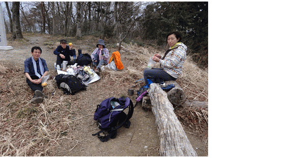 岩室神社に手を合わせ、早速登山開始です。キクザキイチゲなどの花を見ながらジグザグに登ると、あっという間に松岳山の頂上に到着しました。広い頂上で、ゆったりと宴会が出来そうです。