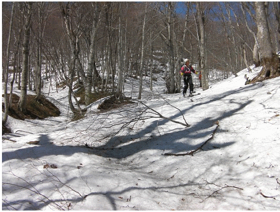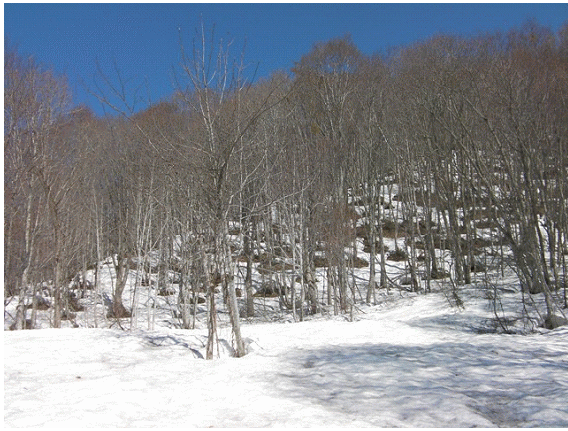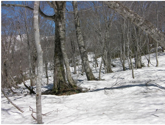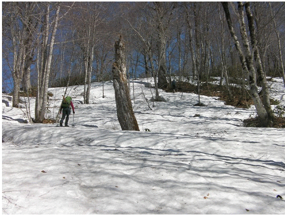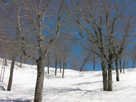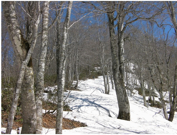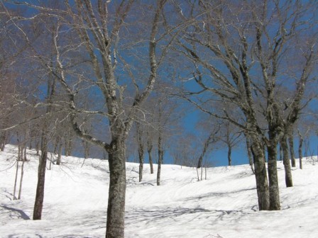 ここからはもう藪は完全に埋まっていて白い雪面に立派なブナが広がる.