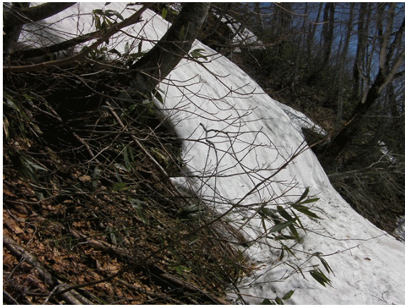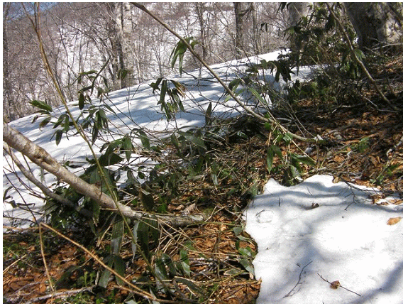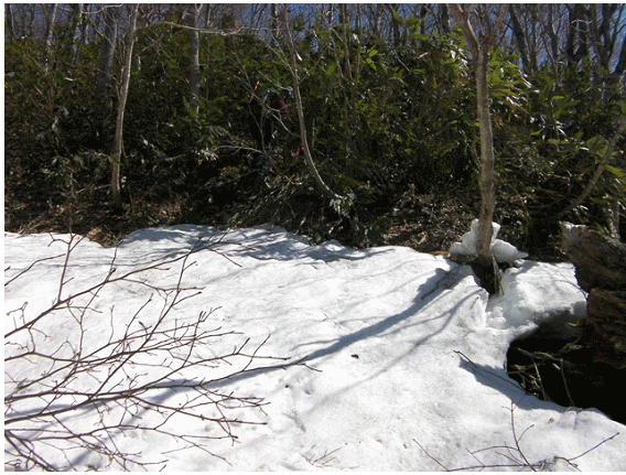 藪を抜けると,会長の言うとおり尾根の東側には雪が比較的多く付いている.