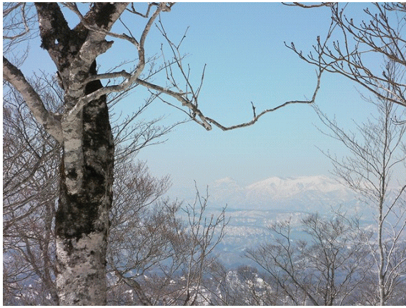 ブナの梢越しに尾瀬の燧ケ岳,会津駒ケ岳が望める.