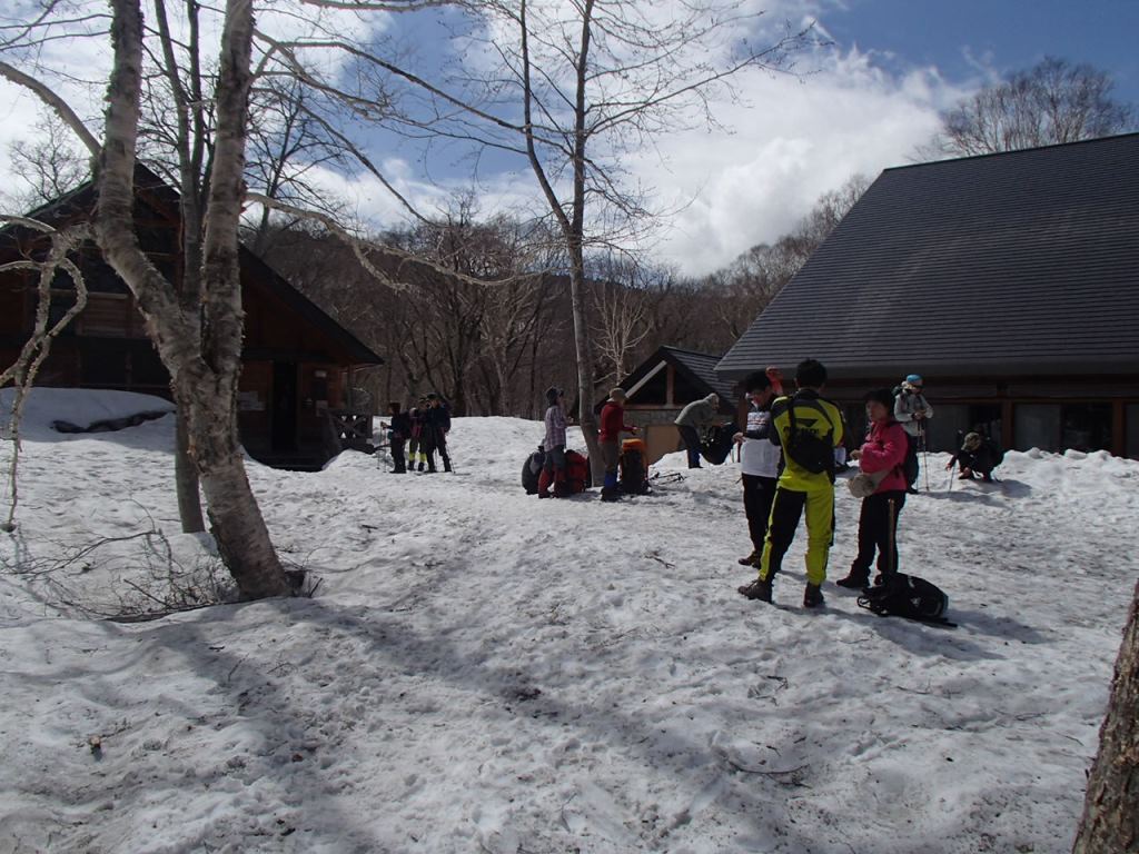 時間もまだお昼頃であり、今日景鶴山に登ってしまおうとアイゼンを装着し、支度を整える。さあ行こうかと思った瞬間、雨がポツリ、ポツリと降ってきた。西の空が暗くなり始め、本降りになりそうな気配だ。どうしようか、悩んだ挙句、天気の悪い時に登ってもしようがないと、明日登ることに決めた。途中の1538ピークまで下見を済ませ、早々と宴会モードに突入した。楽しい話に酒が進み、いち早く、日暮れ前にダウンしてしまう。他のメンバーも準にダウンしていったようだ。食担のWさんには最後まで面倒をみて頂いたようで大変申し訳ありませんでした。