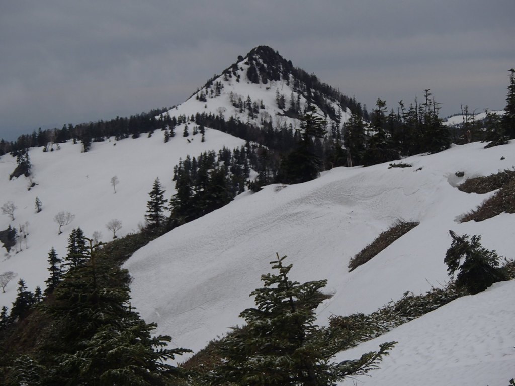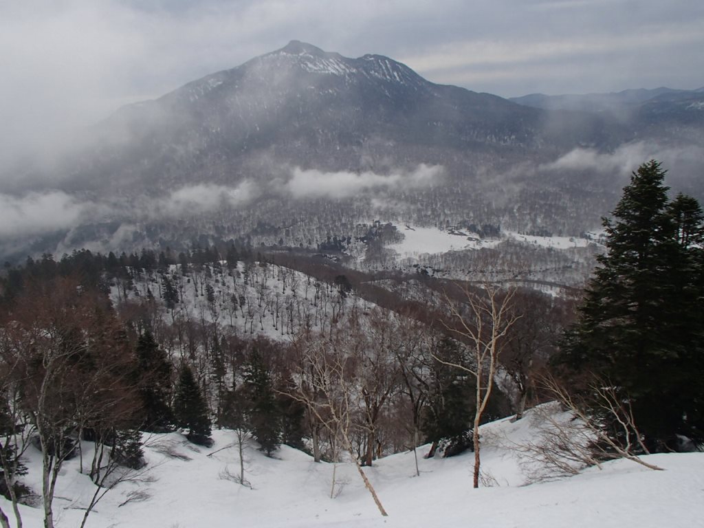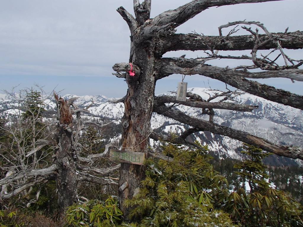 次の日は朝食を早々に済ませ、6時には出発した。前日のトレースもあり、迷うことは無く尾根上を進む。天候は最初曇っていたが、段々回復し晴れ間が広がってきた。昨日の夜中には雨が降ったが、上部は雪だったようで薄く積もっていた。2時間ほど登ると与作岳に到着。一気に360度の展望が開ける。日光、会津、奥利根、上信越、関東の山がすべて見渡せる。景鶴山がとんがって見えている。かなりの傾斜に見え、頂上部は藪に覆われていた。