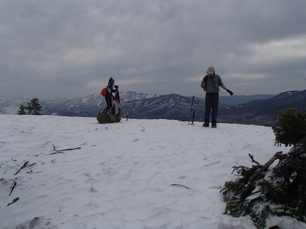 しばし休憩した後、景鶴山に向かって踏み出す。一旦ゆっくりと下り、最後の登り返しだ。急に見えた斜面も、アイゼンを効かせ、順調に登れた。山頂部の藪の部分も踏み跡がついており、藪漕ぎも大してせずに山頂に到着した。山頂は狭く、5人もいると一杯のようで解放感もないが、この時期しか登れない山に登れて、ほっとした。
