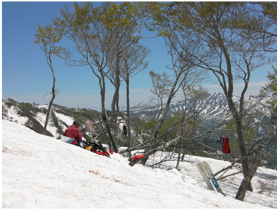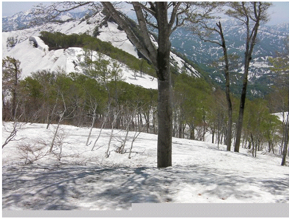 標高1050mの台地に上がるとブナもまばらとなって雪も白くなる.