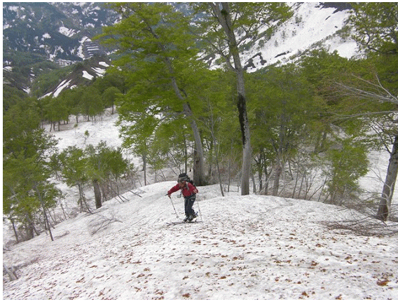 帰りは登りと違って1200m鞍部へブナ林を滑る.