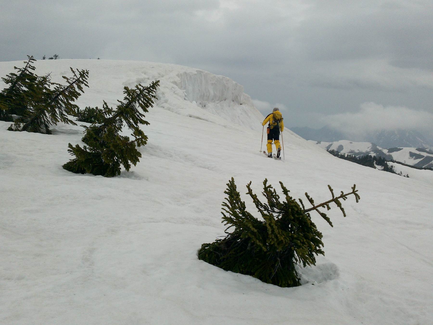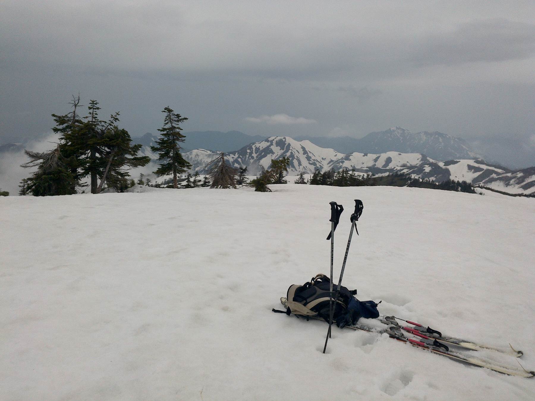 雲行きも怪しく早々にシールを外し下山する、下降路の裏金山谷との中間尾根は雪質も良く期待どおりの快適な滑降ができた、後は登りのルートに戻り下山する。