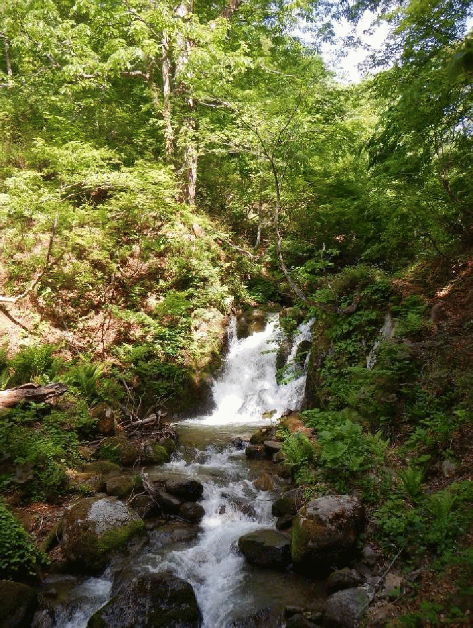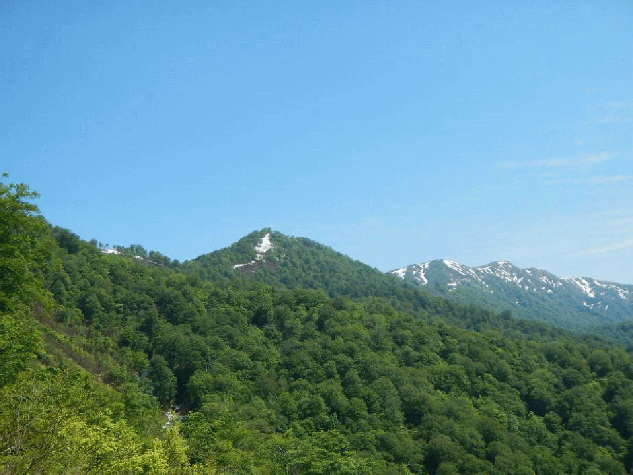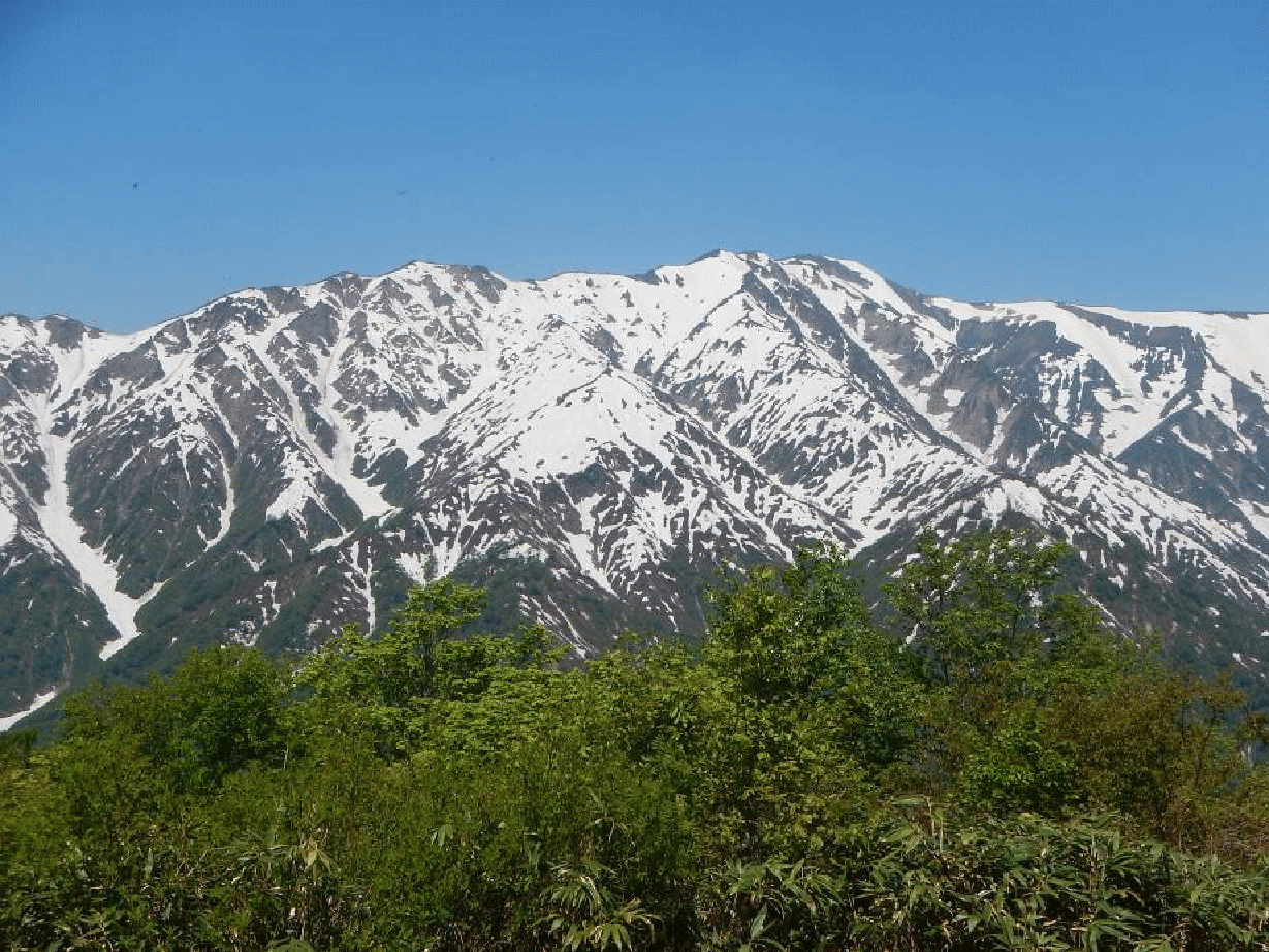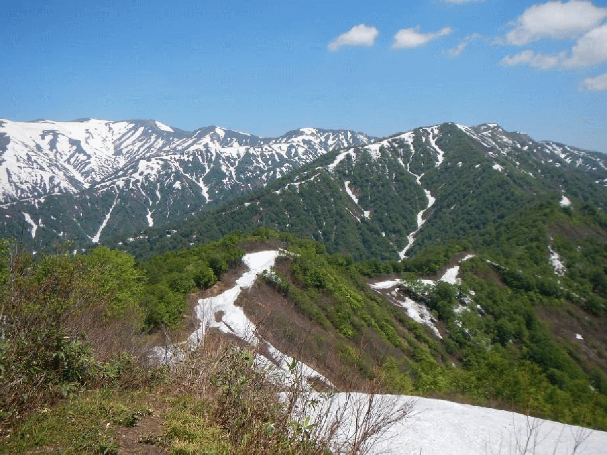 大日岳もそびえ立って見えます。青空と残雪とブナの新緑のコントラストに大歓声をあげました。