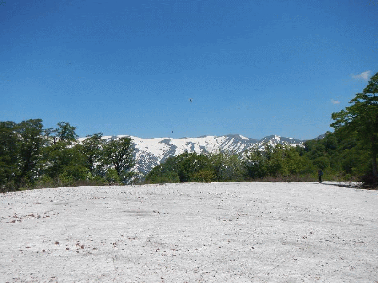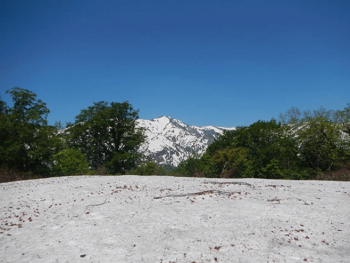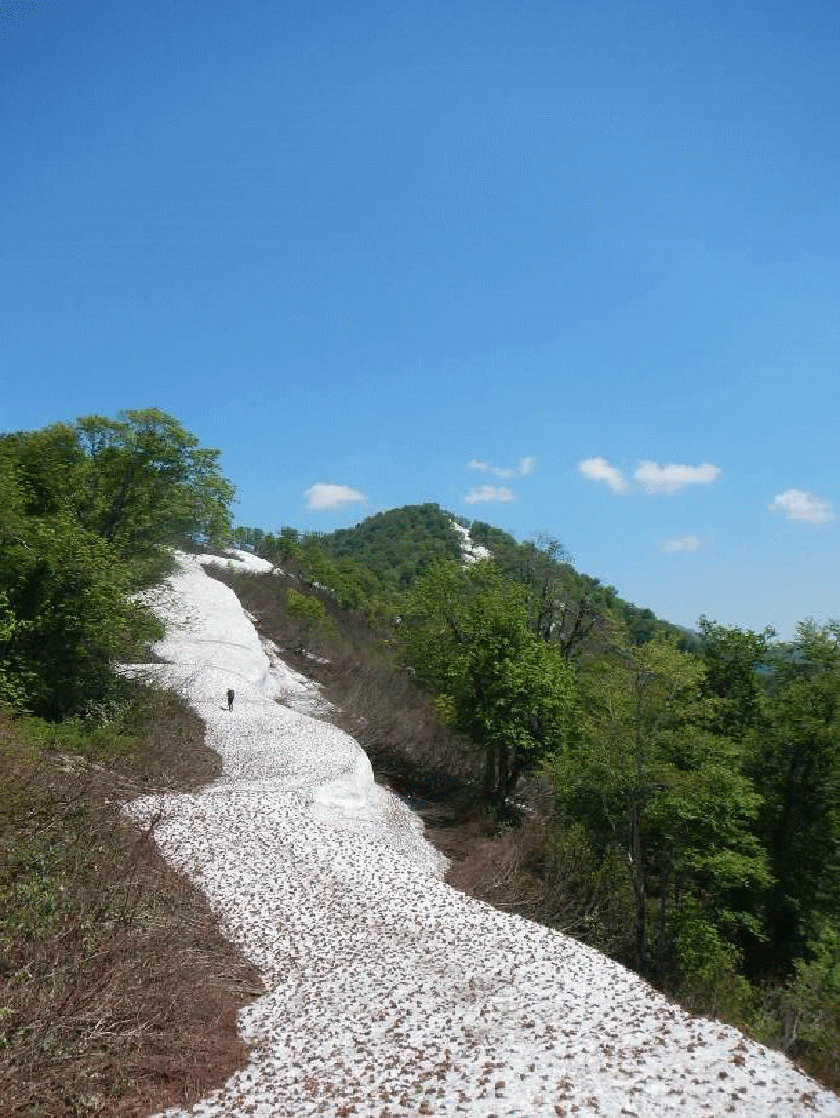 七森峰で主尾根になり、鏡山へと方角を変えます。山頂手前、1200メートルピークへは残雪の上を行きます。