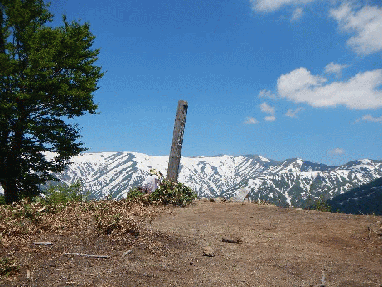 広いピークは雪原が広がり、その向こうに飯豊連峰が目の前に現れました。素晴らしい光景です。