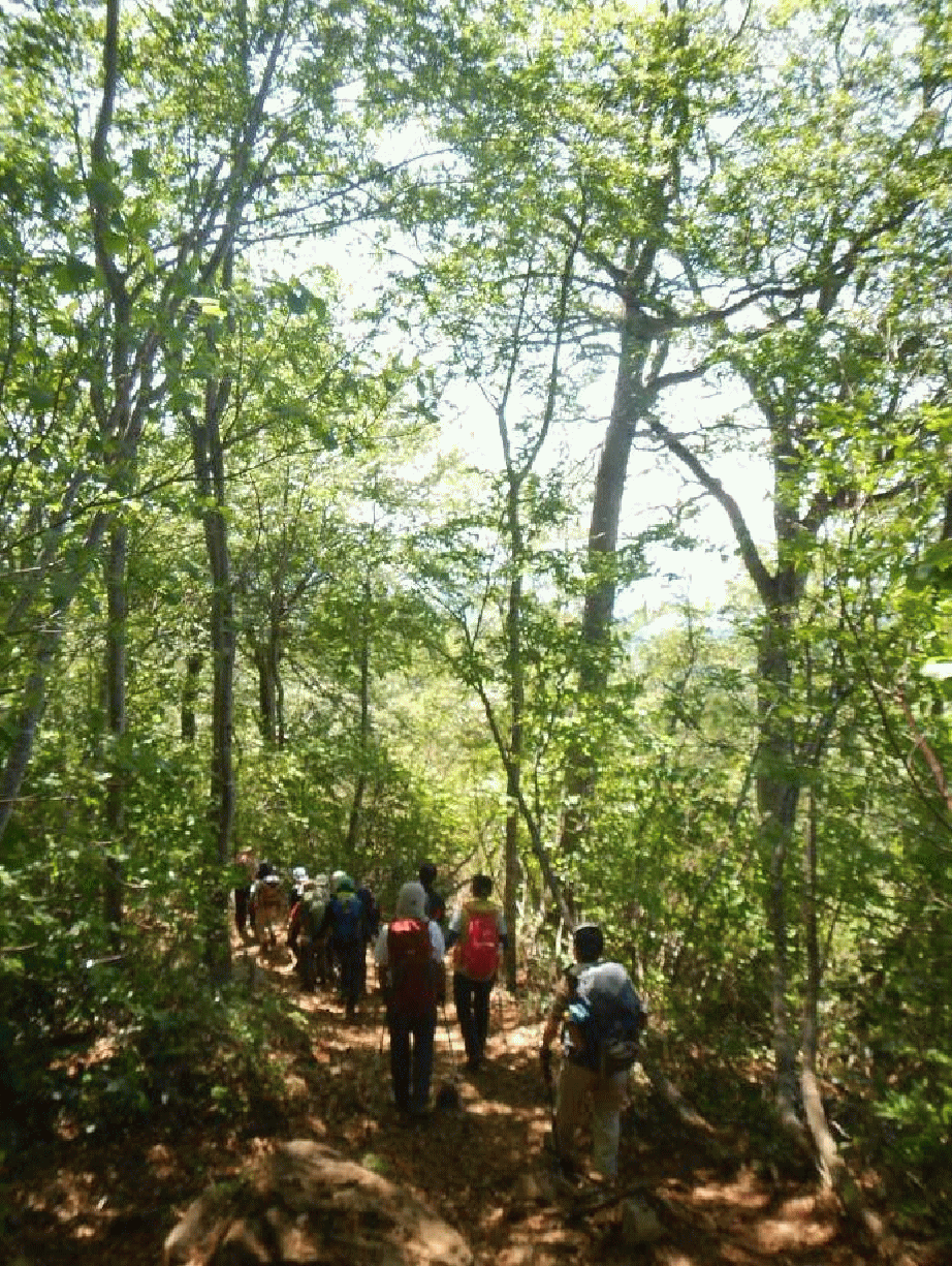 「木漏れ日の中、下山する」