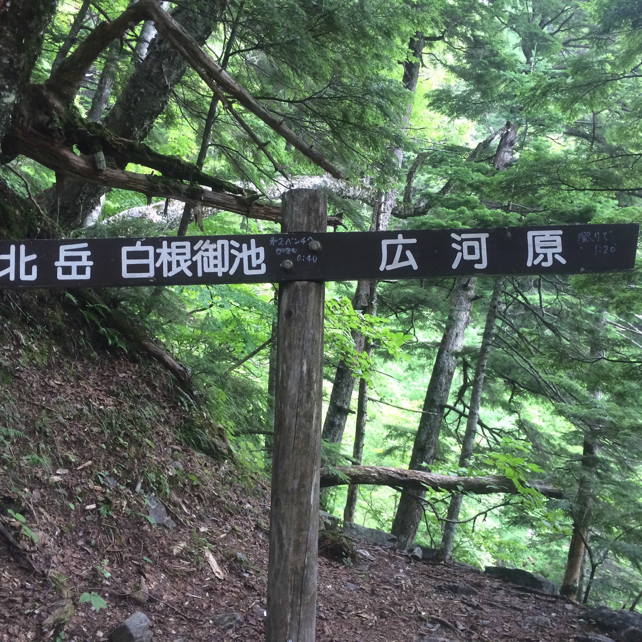 7月22日 新宿発スーパーあずさ(7:00)ー甲府着(8:28)ー甲府発広河原行きバス(9:00) ー広河原着(10:58)ー広河原発(11:02)ー大樺沢分岐(11:30)ー白峰御池小屋(14:10)