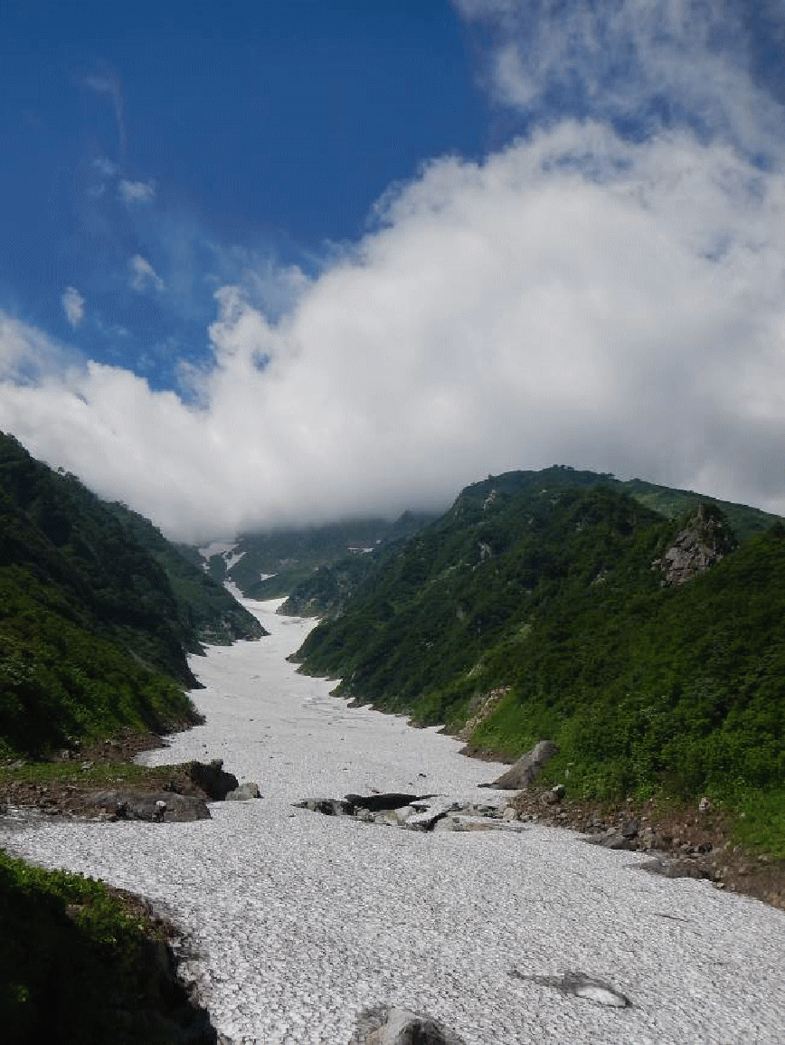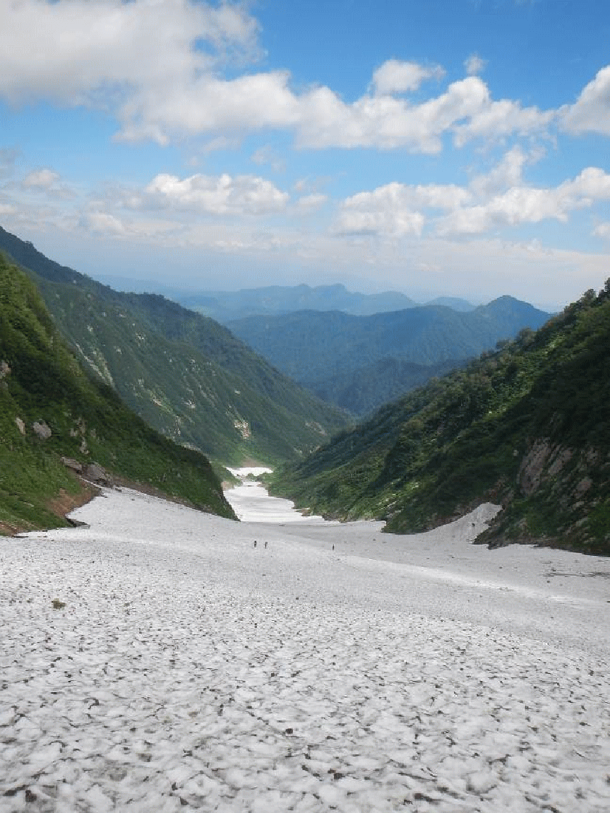 とガスは晴れ、青空となる。急な雪渓を出合まで下りると一安心。温身平までのアップダウンの多い沢