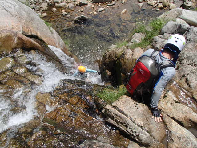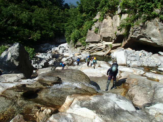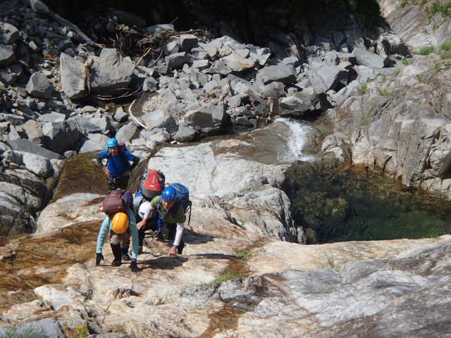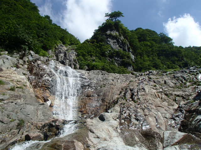 身支度を整え、出発する。米子沢に降りてからしばらくは水のないゴーロを行く。20分位歩いてやっと水流が出て来る。やがてゴーロから一枚岩のナメに変わり水流も増してくる。この辺りから傾斜のあるところではスリップしないように注意が必要だ。最初の連瀑の大滝など捲けるところは迷わず巻く。