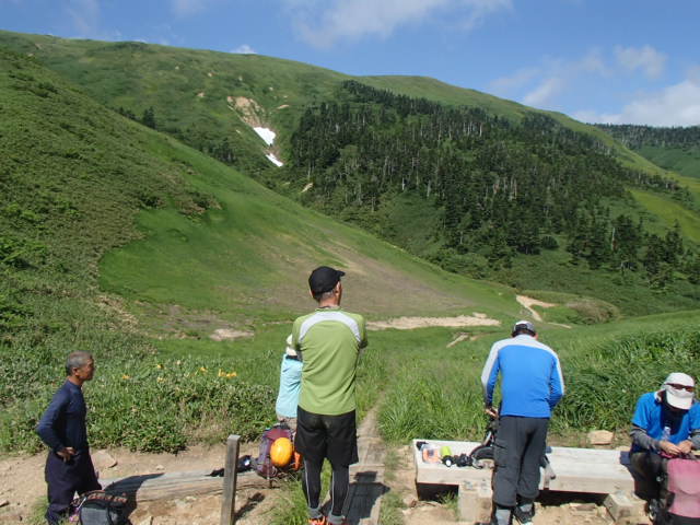 簾状の滝より上は、高さのある滝が出てくるのでロープを出して慎重に登った。2段の滝を超え、上部のナメ帯に到着すると傾斜も緩むが、始めの内は滑ると流れて滝まで持っていかれそうなのでまだここでは休めない。しばらく行って傾斜が緩んだところで休憩する。草原の中にナメ沢が続いている。何度来ても良い景観だ。更に進み二俣を左に行き、避難小屋の水場に到着。沢登りの終点で、金具を外し靴を履きかえて避難小屋に向かう。比較的ゆっくりペースできたので皆、そう疲れてもいないようだ。避難小屋前は涼しく爽快だった。小一時間の休憩の後、井戸尾根を下山する。7合目より下の登山道は気温も高く、体の中まで熱くなり、一気に体力を奪われる。本日最大の試練だった。