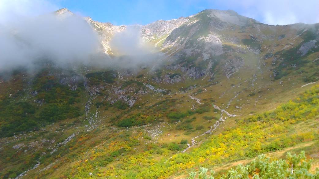 抜戸南尾根に上がると急登から開放され目の前に杓子平が広がる適度に紅葉が始まっていて大変綺麗であった。