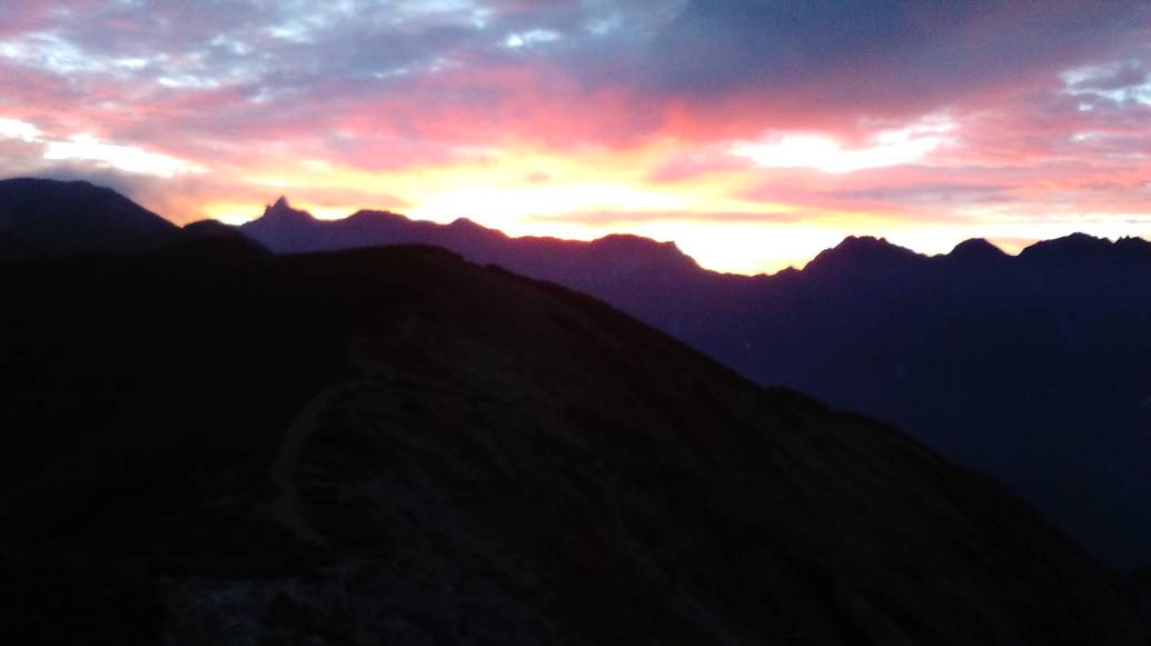 二日目は長い一日となった、槍ヶ岳まで行くため薄明けの中テント場を出発する。槍〜穂高の稜線が真っ赤な空に黒いシルエットでくっきりと見え絶景である。しまった!この風景の写真を撮るとスマホの電池が無くなった残念だがこの先カメラが使えない。抜戸岳を越えてからの笠ヶ岳も雄大で何度も振り返り見た。秩父平は綺麗なところで宮様も感激したのが納得できる。次のギャップは大ノマ乗越、ここは山スキーで双六へ登るメインルートで5月の連休は賑わっている、乗越から左俣谷側へスキー向きの斜面が続いているチャンスがあれば訪れてみたい。大ノマ岳あたりより人が多くなり、弓折岳・鏡平分岐〜双六までツアー登山グループが多く道のすれ違いに時間を取られた。