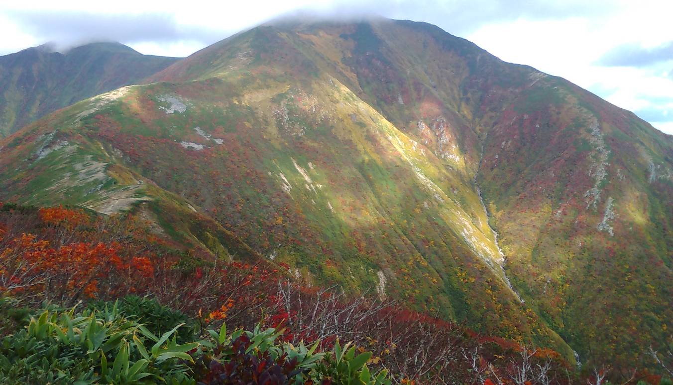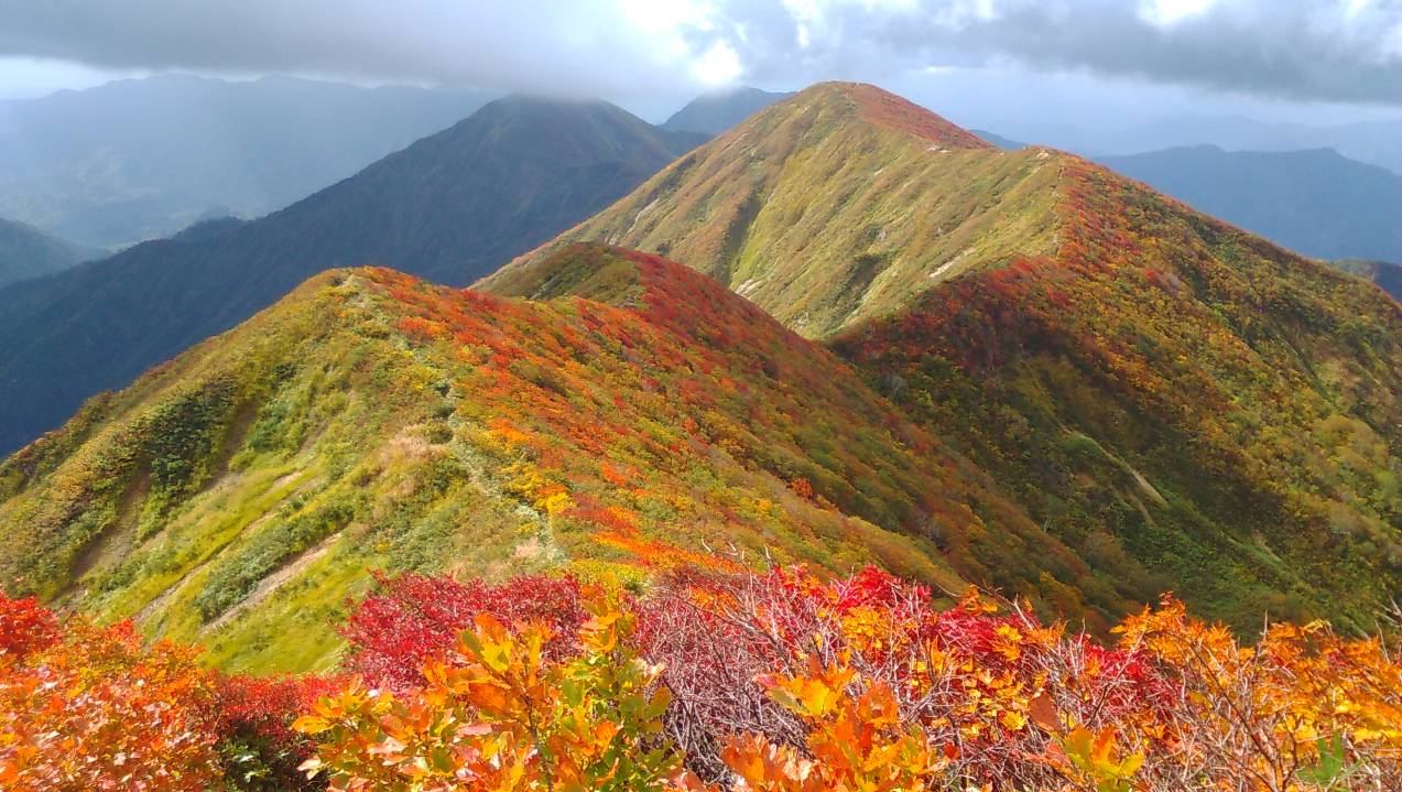 紅葉を見に朝日連峰の稜線に行ってきた。大朝日まで行く予定だったが、風が強く頂上付近は雲が激しく流れており平岩山で中止した。帰路は山ブドウやキノコを探しながら歩いた。