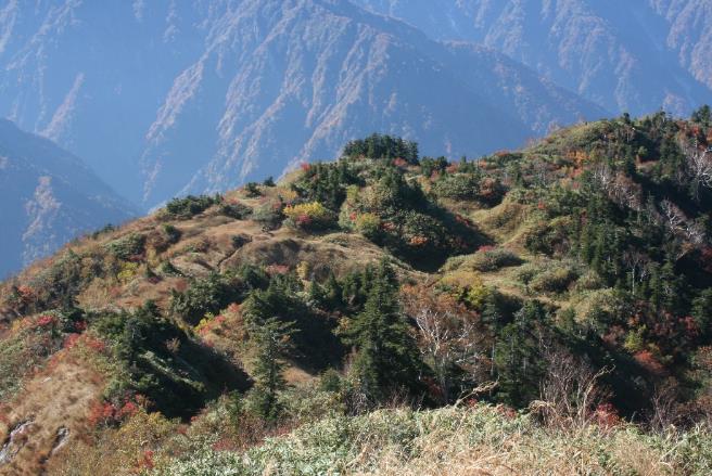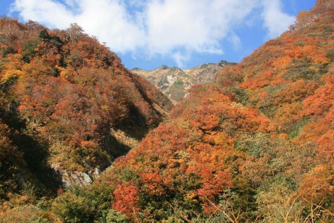 剣岳と別れてブナグラ谷を下る。道を見失いそうになる所もあるが気をつけていれば問題ない。再び朝の工事用道路に出て車道を馬場島まで行く。今は馬場島が紅葉の盛りでキャンプ場にも何人もの人が来ていた。山上の紅葉は10月上旬が見ごろだろう。