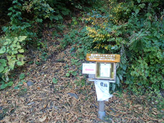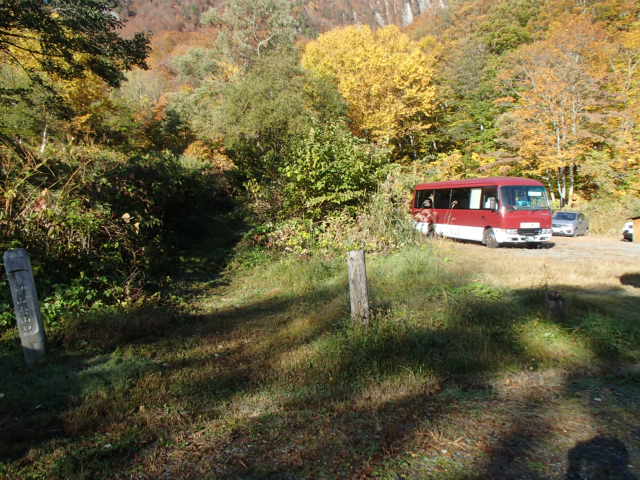 天気は快晴で青空と紅葉が美しく、又と無い登山日和である。秋山郷の国道405号線で前をマイクロバスが走っていたが、途中で屋敷方面に曲がって行った。こちらは直進し切明温泉方面に車を走らせる。雄川閣の前を通り、むじな平の登山口に着くと、先程のマイクロバスが到着していて、20名以上の団体だろうか?出発の準備をしていた。こちらが遠回りだったようだ。バスの団体名を確認すると新潟のR会の人達だった。点呼をして出発していった。こちらも追いかけるように出発する。