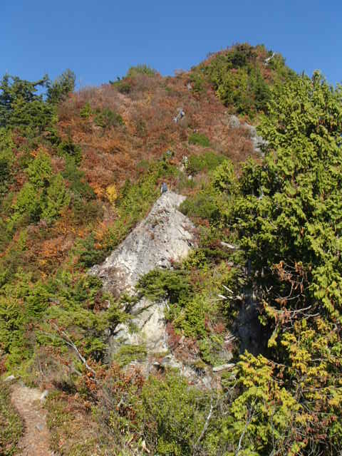 最初からなかなかの急登が続く。一時間程の登ると万仏岩という岩稜地帯に到着。梯子や鎖がついているので怖くはないが、傾斜があるので3点確保はしっかりとしたいところ。岩場通過の上部の方でR会の人から道を譲ってもらい先に行かせもらった。細い尾根なので見晴らしは良い。目指す先に鳥甲山と勘違いする白ーの頭が見える。白ーの頭は樹林に囲まれ展望はない。今までの急な登りに疲れ、休憩しているとWさんが雨具の落し物を見つけた。落とし主が気付いて取りに来るかもれないしどうしようかと考えたあげく、持っていくことにした。カミソリ岩付近は急峻な岩場の通過はまるでジェットコースターのようだ。何度もピークを通過し、最後の急登を経てようやく鳥甲山に到着した。