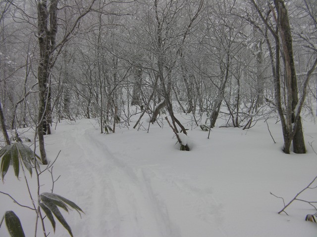 先行トレースは1050m付近の平坦地から,いつも登る尾根へそのまま急登する.