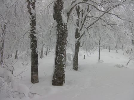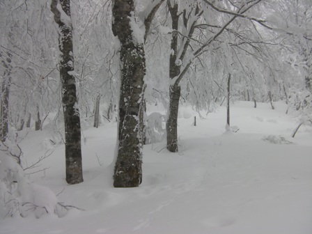 ブナの白い木肌が雪面に映える.