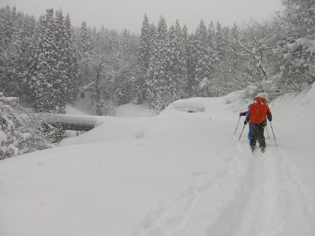 林道に出ると,登りに付けたトレースに新しい雪が10cm程度更に積もっているが,それなりに滑る.