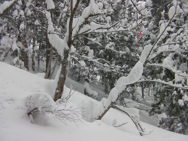 標高500m付近で昨年付けた赤テープを発見し,ここで休憩する.